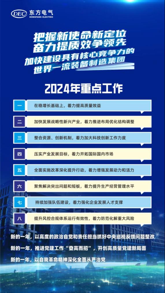 俞培根指出,2024年是落實(shí)“領(lǐng)先戰(zhàn)略”和“11256”發(fā)展戰(zhàn)略,推進(jìn)集團(tuán)公司轉(zhuǎn)型發(fā)展的關(guān)鍵之年,做好全年的工作尤為重要。全集團(tuán)要堅(jiān)持以習(xí)近平新時(shí)代中國(guó)特色社會(huì)主義思想為指導(dǎo),全面貫徹落實(shí)黨的二十大和二十屆二中全會(huì)、中央經(jīng)濟(jì)工作會(huì)議精神,深入貫徹落實(shí)習(xí)近平總書(shū)記關(guān)于國(guó)有企業(yè)改革發(fā)展和黨的建設(shè)重要論述,認(rèn)真貫徹落實(shí)習(xí)近平總書(shū)記“弘揚(yáng)可貴的‘東汽精神’”“做排頭兵、走在前列”的重要要求,把握國(guó)資央企新使命新定位,完整、準(zhǔn)確、全面貫徹新發(fā)展理念,更好服務(wù)加快構(gòu)建新發(fā)展格局、推進(jìn)新型工業(yè)化,堅(jiān)持穩(wěn)中求進(jìn)、以進(jìn)促穩(wěn)、先立后破,增強(qiáng)核心功能、提高核心競(jìng)爭(zhēng)力,落實(shí)“領(lǐng)先戰(zhàn)略”,強(qiáng)化創(chuàng)新驅(qū)動(dòng),提升經(jīng)濟(jì)效益,持續(xù)推動(dòng)集團(tuán)公司高質(zhì)量發(fā)展,實(shí)現(xiàn)生產(chǎn)經(jīng)營(yíng)質(zhì)的有效提升和量的合理增長(zhǎng),加快建設(shè)具有核心競(jìng)爭(zhēng)力的世界一流裝備制造集團(tuán)。