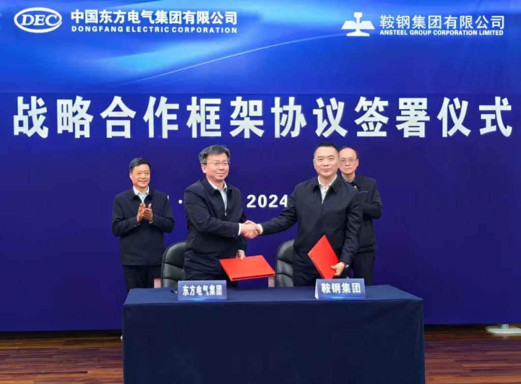 本網(wǎng)訊 4月20日,東方電氣集團(tuán)黨組書(shū)記、董事長(zhǎng)俞培根與鞍鋼集團(tuán)黨委書(shū)記、董事長(zhǎng)譚成旭在遼寧鞍山舉行會(huì)談,并見(jiàn)證雙方簽署戰(zhàn)略合作框架協(xié)議,東方電氣集團(tuán)黨組成員、副總經(jīng)理李忠軍,鞍鋼集團(tuán)黨委常委、副總經(jīng)理、攀鋼董事長(zhǎng)徐世帥代表雙方簽字。