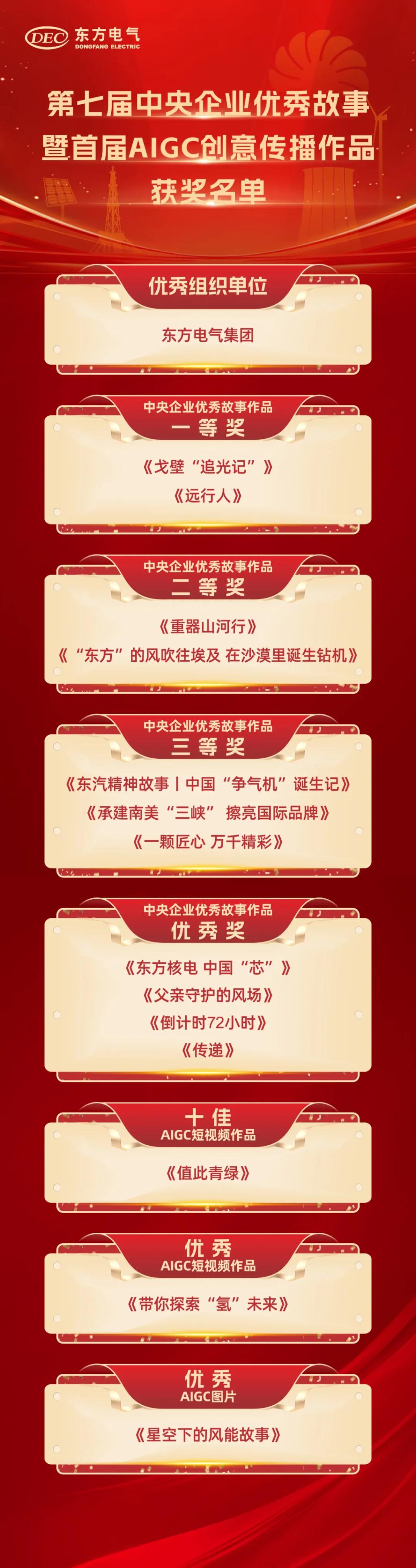 宋致遠(yuǎn)指出,中央企業(yè)處于我國科技創(chuàng)新鏈條的關(guān)鍵樞紐位置,是向世界展現(xiàn)我國形象的重要窗口。東方電氣集團(tuán)作為高端裝備制造領(lǐng)域的“國家隊(duì)”主力,錨定建設(shè)世界一流裝備制造集團(tuán)目標(biāo),在科技創(chuàng)新浪潮中奮楫爭先,用心講好央企科技創(chuàng)新故事,矢志讓飽含溫度與深度的中國故事,跨越國界,與世界同頻共振、“共情共鳴”。東方電氣集團(tuán)愿攜手同仁摯友,共同呈現(xiàn)國資央企在推進(jìn)中國式現(xiàn)代化進(jìn)程里的使命擔(dān)當(dāng)。 活動現(xiàn)場發(fā)布了獲獎作品、優(yōu)秀組織單位名單等并進(jìn)行頒獎,東方電氣集團(tuán)獲評優(yōu)秀組織單位,共14部作品獲獎,有力展現(xiàn)了集團(tuán)公司在宣傳思想文化領(lǐng)域的新成果新氣象。