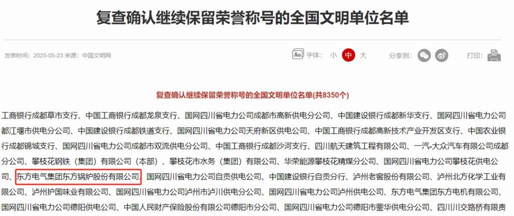 5月23日,中央宣傳思想文化工作領(lǐng)導(dǎo)小組發(fā)布了《中央宣傳思想文化工作領(lǐng)導(dǎo)小組關(guān)于復(fù)查確認(rèn)繼續(xù)保留榮譽(yù)稱號(hào)的全國(guó)文明城市、文明村鎮(zhèn)、文明單位、文明家庭、文明校園的通報(bào)》,東方鍋爐位列其中,標(biāo)志著成功通過復(fù)查工作,繼續(xù)保持國(guó)家級(jí)文明單位殊榮。