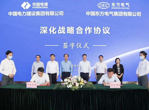 本網(wǎng)訊 9月28日,中國東方電氣集團有限公司與中國電力建設(shè)集團有限公司在蓉簽署深化戰(zhàn)略合作協(xié)議。在東方電氣集團黨組書記、董事長俞培根和中國電建黨委書記、董事長丁焰章的共同見證下,東方電氣集團黨組成員、副總經(jīng)理李忠軍和中國電建總經(jīng)濟師劉明江代表雙方在深化戰(zhàn)略合作協(xié)議上簽字。